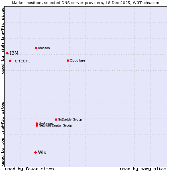 TechnologiesContent ManagementServer-side Languages Client-side Languages JavaScript Libraries CSS Frameworks Web Servers Web Panels Operating Systems Web Hosting Data Centers Reverse Proxies DNS Servers Email Servers SSL Certificate Authorities Content Delivery Traffic Analysis Tools Advertising Networks Tag Managers Social Widgets Site Elements Structured Data Markup Languages Character Encodings Image File Formats Top Level Domains Server Locations Content Languages | Technologies > DNS Servers > Technology usage comparison Comparison of the usage statistics of Wix vs. Tencent vs. IBM for websitesThis report shows the usage statistics of Wix vs. Tencent vs. IBM as DNS server provider on the web. See technologies overview for explanations on the methodologies used in the surveys. Our reports are updated daily. UsageThis diagram shows the percentages of websites using the selected technologies. How to read the diagram: