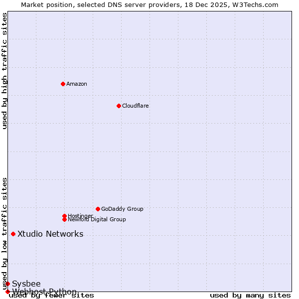 TechnologiesContent ManagementServer-side Languages Client-side Languages JavaScript Libraries CSS Frameworks Web Servers Web Panels Operating Systems Web Hosting Data Centers Reverse Proxies DNS Servers Email Servers SSL Certificate Authorities Content Delivery Traffic Analysis Tools Advertising Networks Tag Managers Social Widgets Site Elements Structured Data Markup Languages Character Encodings Image File Formats Top Level Domains Server Locations Content Languages | Technologies > DNS Servers > Technology usage comparison Comparison of the usage statistics of Xtudio Networks vs. Sysbee vs. Webhost Python for websitesThis report shows the usage statistics of Xtudio Networks vs. Sysbee vs. Webhost Python as DNS server provider on the web. See technologies overview for explanations on the methodologies used in the surveys. Our reports are updated daily. UsageThis diagram shows the percentages of websites using the selected technologies. How to read the diagram: