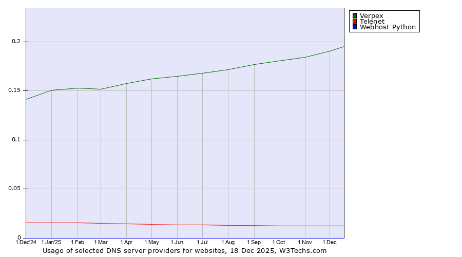 TechnologiesContent ManagementServer-side Languages Client-side Languages JavaScript Libraries CSS Frameworks Web Servers Web Panels Operating Systems Web Hosting Data Centers Reverse Proxies DNS Servers Email Servers SSL Certificate Authorities Content Delivery Traffic Analysis Tools Advertising Networks Tag Managers Social Widgets Site Elements Structured Data Markup Languages Character Encodings Image File Formats Top Level Domains Server Locations Content Languages | Technologies > DNS Servers > Technology usage comparison Comparison of the usage statistics of Verpex vs. Telenet vs. Webhost Python for websitesThis report shows the usage statistics of Verpex vs. Telenet vs. Webhost Python as DNS server provider on the web. See technologies overview for explanations on the methodologies used in the surveys. Our reports are updated daily. UsageThis diagram shows the percentages of websites using the selected technologies. How to read the diagram: