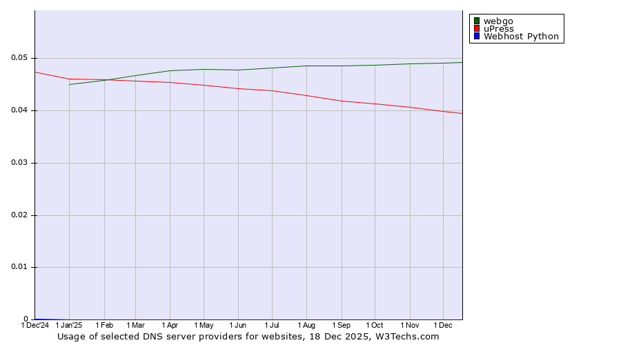 TechnologiesContent ManagementServer-side Languages Client-side Languages JavaScript Libraries CSS Frameworks Web Servers Web Panels Operating Systems Web Hosting Data Centers Reverse Proxies DNS Servers Email Servers SSL Certificate Authorities Content Delivery Traffic Analysis Tools Advertising Networks Tag Managers Social Widgets Site Elements Structured Data Markup Languages Character Encodings Image File Formats Top Level Domains Server Locations Content Languages | Technologies > DNS Servers > Technology usage comparison Comparison of the usage statistics of webgo vs. uPress vs. Webhost Python for websitesThis report shows the usage statistics of webgo vs. uPress vs. Webhost Python as DNS server provider on the web. See technologies overview for explanations on the methodologies used in the surveys. Our reports are updated daily. UsageThis diagram shows the percentages of websites using the selected technologies. How to read the diagram: