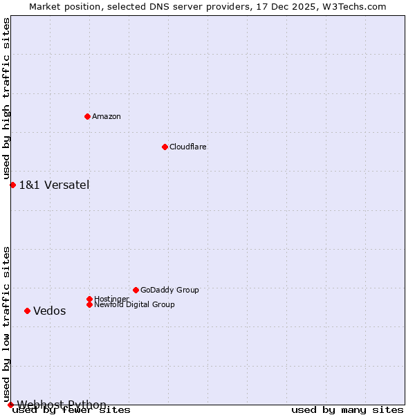 TechnologiesContent ManagementServer-side Languages Client-side Languages JavaScript Libraries CSS Frameworks Web Servers Web Panels Operating Systems Web Hosting Data Centers Reverse Proxies DNS Servers Email Servers SSL Certificate Authorities Content Delivery Traffic Analysis Tools Advertising Networks Tag Managers Social Widgets Site Elements Structured Data Markup Languages Character Encodings Image File Formats Top Level Domains Server Locations Content Languages | Technologies > DNS Servers > Technology usage comparison Comparison of the usage statistics of Vedos vs. 1&1 Versatel vs. Webhost Python for websitesThis report shows the usage statistics of Vedos vs. 1&1 Versatel vs. Webhost Python as DNS server provider on the web. See technologies overview for explanations on the methodologies used in the surveys. Our reports are updated daily. UsageThis diagram shows the percentages of websites using the selected technologies. How to read the diagram:
