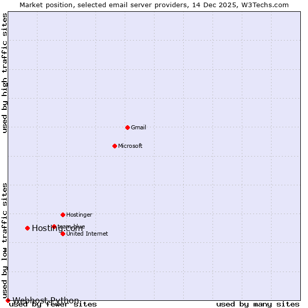 TechnologiesContent ManagementServer-side Languages Client-side Languages JavaScript Libraries CSS Frameworks Web Servers Web Panels Operating Systems Web Hosting Data Centers Reverse Proxies DNS Servers Email Servers SSL Certificate Authorities Content Delivery Traffic Analysis Tools Advertising Networks Tag Managers Social Widgets Site Elements Structured Data Markup Languages Character Encodings Image File Formats Top Level Domains Server Locations Content Languages ComparisonCompare with other | Technologies > Email Servers > Technology usage comparison Comparison of the usage statistics of Hosting.com vs. Webhost Python for websitesThis report shows the usage statistics of Hosting.com vs. Webhost Python as email server provider on the web. See technologies overview for explanations on the methodologies used in the surveys. Our reports are updated daily. UsageThis diagram shows the percentages of websites using the selected technologies. How to read the diagram: