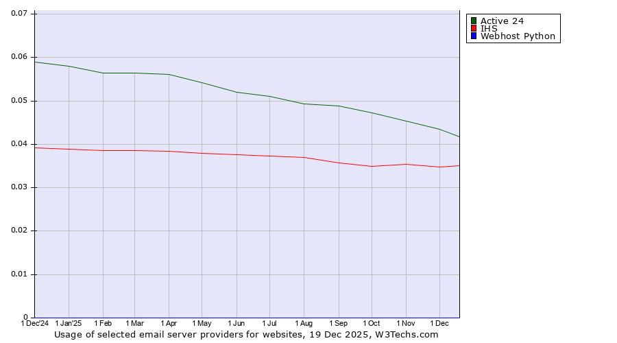 TechnologiesContent ManagementServer-side Languages Client-side Languages JavaScript Libraries CSS Frameworks Web Servers Web Panels Operating Systems Web Hosting Data Centers Reverse Proxies DNS Servers Email Servers SSL Certificate Authorities Content Delivery Traffic Analysis Tools Advertising Networks Tag Managers Social Widgets Site Elements Structured Data Markup Languages Character Encodings Image File Formats Top Level Domains Server Locations Content Languages | Technologies > Email Servers > Technology usage comparison Comparison of the usage statistics of Active 24 vs. IHS vs. Webhost Python for websitesThis report shows the usage statistics of Active 24 vs. IHS vs. Webhost Python as email server provider on the web. See technologies overview for explanations on the methodologies used in the surveys. Our reports are updated daily. UsageThis diagram shows the percentages of websites using the selected technologies. How to read the diagram: