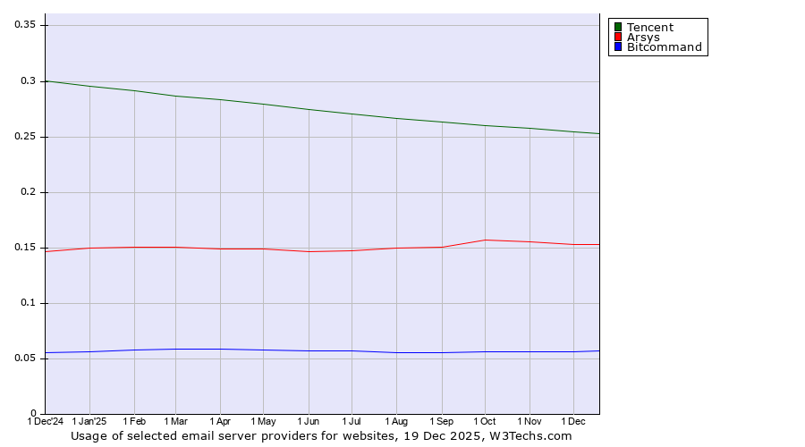 TechnologiesContent ManagementServer-side Languages Client-side Languages JavaScript Libraries CSS Frameworks Web Servers Web Panels Operating Systems Web Hosting Data Centers Reverse Proxies DNS Servers Email Servers SSL Certificate Authorities Content Delivery Traffic Analysis Tools Advertising Networks Tag Managers Social Widgets Site Elements Structured Data Markup Languages Character Encodings Image File Formats Top Level Domains Server Locations Content Languages | Technologies > Email Servers > Technology usage comparison Comparison of the usage statistics of Tencent vs. Arsys vs. Bitcommand for websitesThis report shows the usage statistics of Tencent vs. Arsys vs. Bitcommand as email server provider on the web. See technologies overview for explanations on the methodologies used in the surveys. Our reports are updated daily. UsageThis diagram shows the percentages of websites using the selected technologies. How to read the diagram: