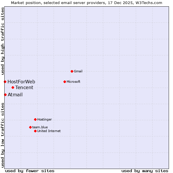 TechnologiesContent ManagementServer-side Languages Client-side Languages JavaScript Libraries CSS Frameworks Web Servers Web Panels Operating Systems Web Hosting Data Centers Reverse Proxies DNS Servers Email Servers SSL Certificate Authorities Content Delivery Traffic Analysis Tools Advertising Networks Tag Managers Social Widgets Site Elements Structured Data Markup Languages Character Encodings Image File Formats Top Level Domains Server Locations Content Languages | Technologies > Email Servers > Technology usage comparison Comparison of the usage statistics of Tencent vs. Atmail vs. HostForWeb for websitesThis report shows the usage statistics of Tencent vs. Atmail vs. HostForWeb as email server provider on the web. See technologies overview for explanations on the methodologies used in the surveys. Our reports are updated daily. UsageThis diagram shows the percentages of websites using the selected technologies. How to read the diagram: