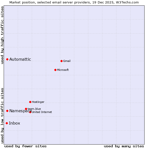 TechnologiesContent ManagementServer-side Languages Client-side Languages JavaScript Libraries CSS Frameworks Web Servers Web Panels Operating Systems Web Hosting Data Centers Reverse Proxies DNS Servers Email Servers SSL Certificate Authorities Content Delivery Traffic Analysis Tools Advertising Networks Tag Managers Social Widgets Site Elements Structured Data Markup Languages Character Encodings Image File Formats Top Level Domains Server Locations Content Languages | Technologies > Email Servers > Technology usage comparison Comparison of the usage statistics of Automattic vs. Namespace vs. Inbox for websitesThis report shows the usage statistics of Automattic vs. Namespace vs. Inbox as email server provider on the web. See technologies overview for explanations on the methodologies used in the surveys. Our reports are updated daily. UsageThis diagram shows the percentages of websites using the selected technologies. How to read the diagram: