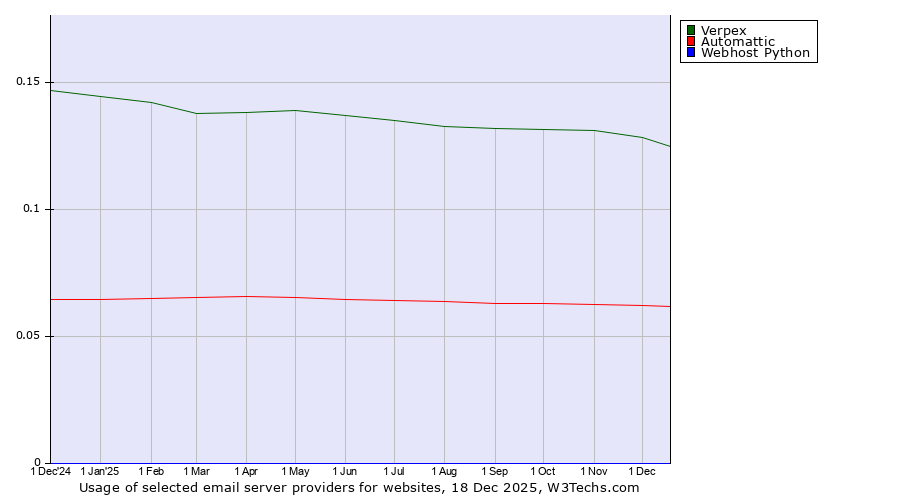TechnologiesContent ManagementServer-side Languages Client-side Languages JavaScript Libraries CSS Frameworks Web Servers Web Panels Operating Systems Web Hosting Data Centers Reverse Proxies DNS Servers Email Servers SSL Certificate Authorities Content Delivery Traffic Analysis Tools Advertising Networks Tag Managers Social Widgets Site Elements Structured Data Markup Languages Character Encodings Image File Formats Top Level Domains Server Locations Content Languages | Technologies > Email Servers > Technology usage comparison Comparison of the usage statistics of Verpex vs. Automattic vs. Webhost Python for websitesThis report shows the usage statistics of Verpex vs. Automattic vs. Webhost Python as email server provider on the web. See technologies overview for explanations on the methodologies used in the surveys. Our reports are updated daily. UsageThis diagram shows the percentages of websites using the selected technologies. How to read the diagram: