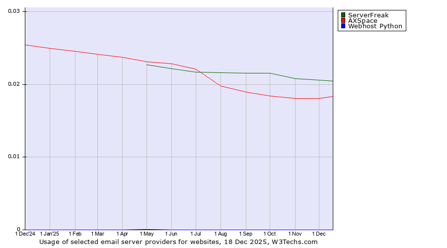 TechnologiesContent ManagementServer-side Languages Client-side Languages JavaScript Libraries CSS Frameworks Web Servers Web Panels Operating Systems Web Hosting Data Centers Reverse Proxies DNS Servers Email Servers SSL Certificate Authorities Content Delivery Traffic Analysis Tools Advertising Networks Tag Managers Social Widgets Site Elements Structured Data Markup Languages Character Encodings Image File Formats Top Level Domains Server Locations Content Languages | Technologies > Email Servers > Technology usage comparison Comparison of the usage statistics of ServerFreak vs. AXSpace vs. Webhost Python for websitesThis report shows the usage statistics of ServerFreak vs. AXSpace vs. Webhost Python as email server provider on the web. See technologies overview for explanations on the methodologies used in the surveys. Our reports are updated daily. UsageThis diagram shows the percentages of websites using the selected technologies. How to read the diagram: