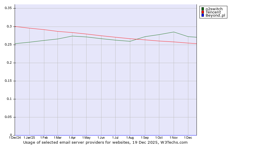 TechnologiesContent ManagementServer-side Languages Client-side Languages JavaScript Libraries CSS Frameworks Web Servers Web Panels Operating Systems Web Hosting Data Centers Reverse Proxies DNS Servers Email Servers SSL Certificate Authorities Content Delivery Traffic Analysis Tools Advertising Networks Tag Managers Social Widgets Site Elements Structured Data Markup Languages Character Encodings Image File Formats Top Level Domains Server Locations Content Languages | Technologies > Email Servers > Technology usage comparison Comparison of the usage statistics of o2switch vs. Tencent vs. Beyond.pl for websitesThis report shows the usage statistics of o2switch vs. Tencent vs. Beyond.pl as email server provider on the web. See technologies overview for explanations on the methodologies used in the surveys. Our reports are updated daily. UsageThis diagram shows the percentages of websites using the selected technologies. How to read the diagram: