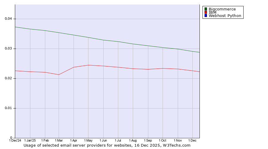 TechnologiesContent ManagementServer-side Languages Client-side Languages JavaScript Libraries CSS Frameworks Web Servers Web Panels Operating Systems Web Hosting Data Centers Reverse Proxies DNS Servers Email Servers SSL Certificate Authorities Content Delivery Traffic Analysis Tools Advertising Networks Tag Managers Social Widgets Site Elements Structured Data Markup Languages Character Encodings Image File Formats Top Level Domains Server Locations Content Languages | Technologies > Email Servers > Technology usage comparison Comparison of the usage statistics of Bigcommerce vs. IBM vs. Webhost Python for websitesThis report shows the usage statistics of Bigcommerce vs. IBM vs. Webhost Python as email server provider on the web. See technologies overview for explanations on the methodologies used in the surveys. Our reports are updated daily. UsageThis diagram shows the percentages of websites using the selected technologies. How to read the diagram: