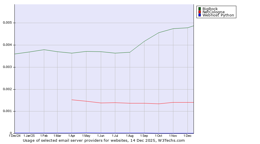 TechnologiesContent ManagementServer-side Languages Client-side Languages JavaScript Libraries CSS Frameworks Web Servers Web Panels Operating Systems Web Hosting Data Centers Reverse Proxies DNS Servers Email Servers SSL Certificate Authorities Content Delivery Traffic Analysis Tools Advertising Networks Tag Managers Social Widgets Site Elements Structured Data Markup Languages Character Encodings Image File Formats Top Level Domains Server Locations Content Languages | Technologies > Email Servers > Technology usage comparison Comparison of the usage statistics of BigRock vs. NetCologne vs. Webhost Python for websitesThis report shows the usage statistics of BigRock vs. NetCologne vs. Webhost Python as email server provider on the web. See technologies overview for explanations on the methodologies used in the surveys. Our reports are updated daily. UsageThis diagram shows the percentages of websites using the selected technologies. How to read the diagram: