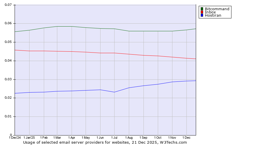 TechnologiesContent ManagementServer-side Languages Client-side Languages JavaScript Libraries CSS Frameworks Web Servers Web Panels Operating Systems Web Hosting Data Centers Reverse Proxies DNS Servers Email Servers SSL Certificate Authorities Content Delivery Traffic Analysis Tools Advertising Networks Tag Managers Social Widgets Site Elements Structured Data Markup Languages Character Encodings Image File Formats Top Level Domains Server Locations Content Languages | Technologies > Email Servers > Technology usage comparison Comparison of the usage statistics of Bitcommand vs. Inbox vs. Hostiran for websitesThis report shows the usage statistics of Bitcommand vs. Inbox vs. Hostiran as email server provider on the web. See technologies overview for explanations on the methodologies used in the surveys. Our reports are updated daily. UsageThis diagram shows the percentages of websites using the selected technologies. How to read the diagram: