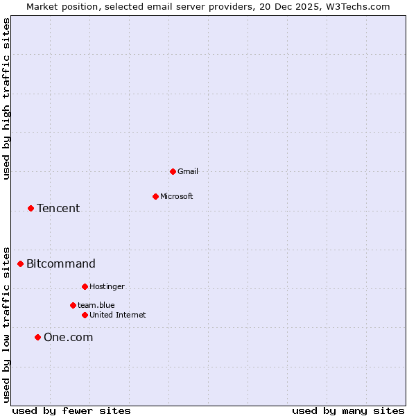 TechnologiesContent ManagementServer-side Languages Client-side Languages JavaScript Libraries CSS Frameworks Web Servers Web Panels Operating Systems Web Hosting Data Centers Reverse Proxies DNS Servers Email Servers SSL Certificate Authorities Content Delivery Traffic Analysis Tools Advertising Networks Tag Managers Social Widgets Site Elements Structured Data Markup Languages Character Encodings Image File Formats Top Level Domains Server Locations Content Languages | Technologies > Email Servers > Technology usage comparison Comparison of the usage statistics of One.com vs. Tencent vs. Bitcommand for websitesThis report shows the usage statistics of One.com vs. Tencent vs. Bitcommand as email server provider on the web. See technologies overview for explanations on the methodologies used in the surveys. Our reports are updated daily. UsageThis diagram shows the percentages of websites using the selected technologies. How to read the diagram: