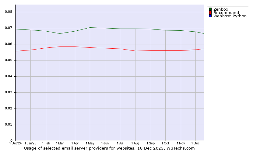 TechnologiesContent ManagementServer-side Languages Client-side Languages JavaScript Libraries CSS Frameworks Web Servers Web Panels Operating Systems Web Hosting Data Centers Reverse Proxies DNS Servers Email Servers SSL Certificate Authorities Content Delivery Traffic Analysis Tools Advertising Networks Tag Managers Social Widgets Site Elements Structured Data Markup Languages Character Encodings Image File Formats Top Level Domains Server Locations Content Languages | Technologies > Email Servers > Technology usage comparison Comparison of the usage statistics of Zenbox vs. Bitcommand vs. Webhost Python for websitesThis report shows the usage statistics of Zenbox vs. Bitcommand vs. Webhost Python as email server provider on the web. See technologies overview for explanations on the methodologies used in the surveys. Our reports are updated daily. UsageThis diagram shows the percentages of websites using the selected technologies. How to read the diagram: