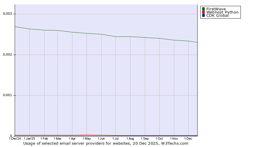 TechnologiesContent ManagementServer-side Languages Client-side Languages JavaScript Libraries CSS Frameworks Web Servers Web Panels Operating Systems Web Hosting Data Centers Reverse Proxies DNS Servers Email Servers SSL Certificate Authorities Content Delivery Traffic Analysis Tools Advertising Networks Tag Managers Social Widgets Site Elements Structured Data Markup Languages Character Encodings Image File Formats Top Level Domains Server Locations Content Languages | Technologies > Email Servers > Technology usage comparison Comparison of the usage statistics of FirstWave vs. Webhost Python vs. CDK Global for websitesThis report shows the usage statistics of FirstWave vs. Webhost Python vs. CDK Global as email server provider on the web. See technologies overview for explanations on the methodologies used in the surveys. Our reports are updated daily. UsageThis diagram shows the percentages of websites using the selected technologies. How to read the diagram: