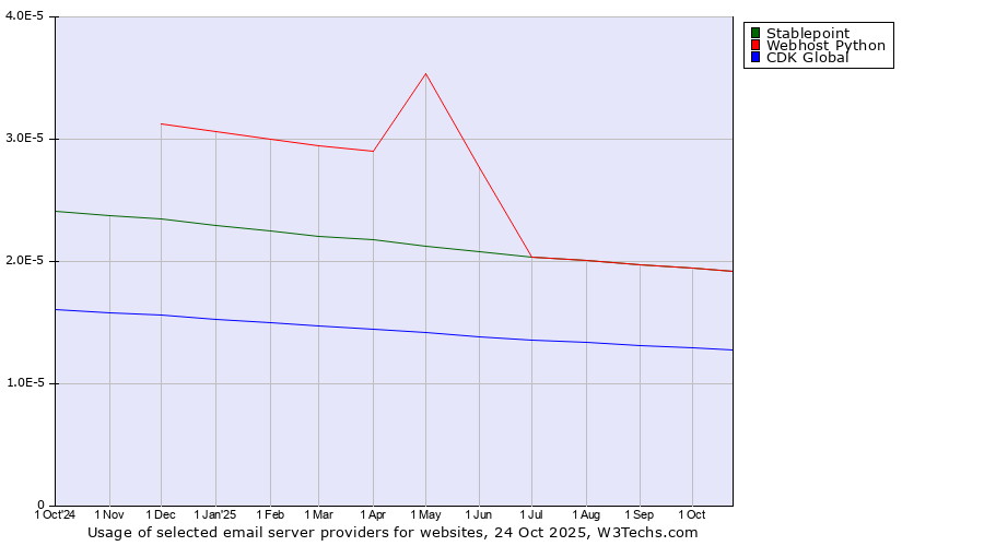 TechnologiesContent ManagementServer-side Languages Client-side Languages JavaScript Libraries CSS Frameworks Web Servers Web Panels Operating Systems Web Hosting Data Centers Reverse Proxies DNS Servers Email Servers SSL Certificate Authorities Content Delivery Traffic Analysis Tools Advertising Networks Tag Managers Social Widgets Site Elements Structured Data Markup Languages Character Encodings Image File Formats Top Level Domains Server Locations Content Languages | Technologies > Email Servers > Technology usage comparison Comparison of the usage statistics of Stablepoint vs. Webhost Python vs. CDK Global for websitesThis report shows the usage statistics of Stablepoint vs. Webhost Python vs. CDK Global as email server provider on the web. See technologies overview for explanations on the methodologies used in the surveys. Our reports are updated daily. UsageThis diagram shows the percentages of websites using the selected technologies. How to read the diagram: