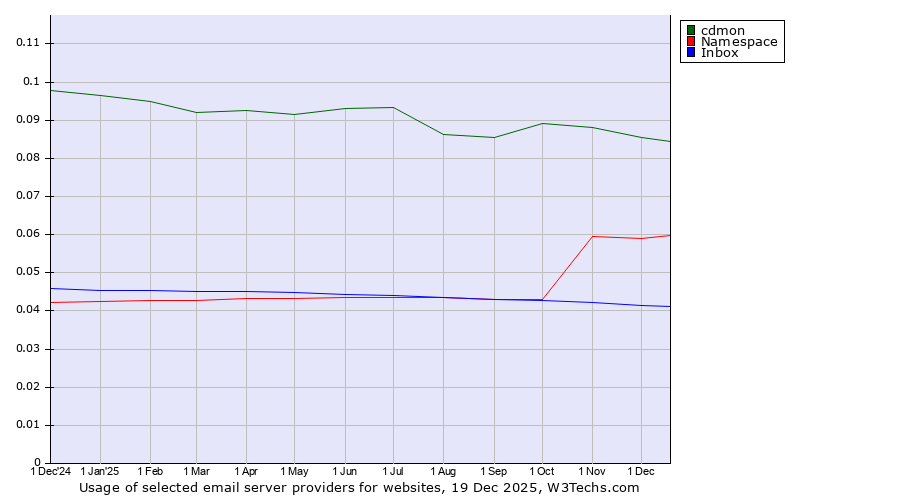 TechnologiesContent ManagementServer-side Languages Client-side Languages JavaScript Libraries CSS Frameworks Web Servers Web Panels Operating Systems Web Hosting Data Centers Reverse Proxies DNS Servers Email Servers SSL Certificate Authorities Content Delivery Traffic Analysis Tools Advertising Networks Tag Managers Social Widgets Site Elements Structured Data Markup Languages Character Encodings Image File Formats Top Level Domains Server Locations Content Languages | Technologies > Email Servers > Technology usage comparison Comparison of the usage statistics of cdmon vs. Namespace vs. Inbox for websitesThis report shows the usage statistics of cdmon vs. Namespace vs. Inbox as email server provider on the web. See technologies overview for explanations on the methodologies used in the surveys. Our reports are updated daily. UsageThis diagram shows the percentages of websites using the selected technologies. How to read the diagram: