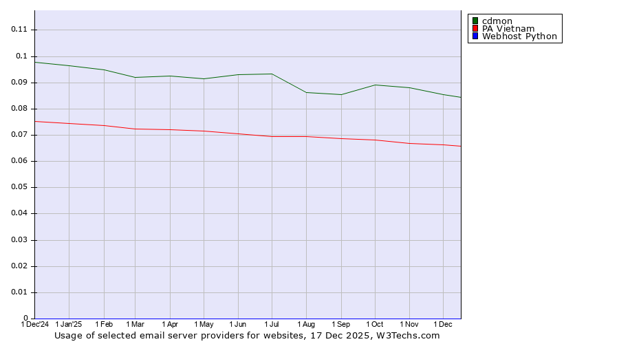 TechnologiesContent ManagementServer-side Languages Client-side Languages JavaScript Libraries CSS Frameworks Web Servers Web Panels Operating Systems Web Hosting Data Centers Reverse Proxies DNS Servers Email Servers SSL Certificate Authorities Content Delivery Traffic Analysis Tools Advertising Networks Tag Managers Social Widgets Site Elements Structured Data Markup Languages Character Encodings Image File Formats Top Level Domains Server Locations Content Languages | Technologies > Email Servers > Technology usage comparison Comparison of the usage statistics of cdmon vs. PA Vietnam vs. Webhost Python for websitesThis report shows the usage statistics of cdmon vs. PA Vietnam vs. Webhost Python as email server provider on the web. See technologies overview for explanations on the methodologies used in the surveys. Our reports are updated daily. UsageThis diagram shows the percentages of websites using the selected technologies. How to read the diagram: