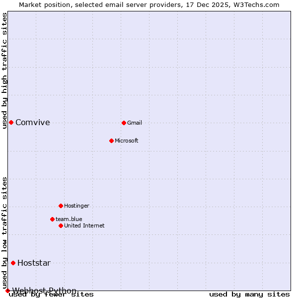 TechnologiesContent ManagementServer-side Languages Client-side Languages JavaScript Libraries CSS Frameworks Web Servers Web Panels Operating Systems Web Hosting Data Centers Reverse Proxies DNS Servers Email Servers SSL Certificate Authorities Content Delivery Traffic Analysis Tools Advertising Networks Tag Managers Social Widgets Site Elements Structured Data Markup Languages Character Encodings Image File Formats Top Level Domains Server Locations Content Languages | Technologies > Email Servers > Technology usage comparison Comparison of the usage statistics of Hoststar vs. Comvive vs. Webhost Python for websitesThis report shows the usage statistics of Hoststar vs. Comvive vs. Webhost Python as email server provider on the web. See technologies overview for explanations on the methodologies used in the surveys. Our reports are updated daily. UsageThis diagram shows the percentages of websites using the selected technologies. How to read the diagram: