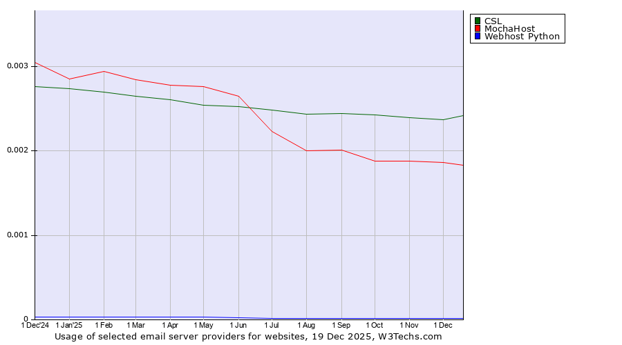 TechnologiesContent ManagementServer-side Languages Client-side Languages JavaScript Libraries CSS Frameworks Web Servers Web Panels Operating Systems Web Hosting Data Centers Reverse Proxies DNS Servers Email Servers SSL Certificate Authorities Content Delivery Traffic Analysis Tools Advertising Networks Tag Managers Social Widgets Site Elements Structured Data Markup Languages Character Encodings Image File Formats Top Level Domains Server Locations Content Languages | Technologies > Email Servers > Technology usage comparison Comparison of the usage statistics of CSL vs. MochaHost vs. Webhost Python for websitesThis report shows the usage statistics of CSL vs. MochaHost vs. Webhost Python as email server provider on the web. See technologies overview for explanations on the methodologies used in the surveys. Our reports are updated daily. UsageThis diagram shows the percentages of websites using the selected technologies. How to read the diagram: