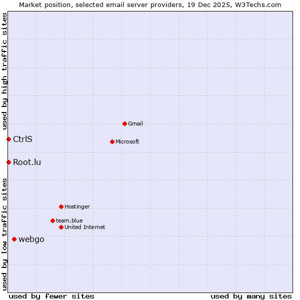 TechnologiesContent ManagementServer-side Languages Client-side Languages JavaScript Libraries CSS Frameworks Web Servers Web Panels Operating Systems Web Hosting Data Centers Reverse Proxies DNS Servers Email Servers SSL Certificate Authorities Content Delivery Traffic Analysis Tools Advertising Networks Tag Managers Social Widgets Site Elements Structured Data Markup Languages Character Encodings Image File Formats Top Level Domains Server Locations Content Languages | Technologies > Email Servers > Technology usage comparison Comparison of the usage statistics of webgo vs. CtrlS vs. Root.lu for websitesThis report shows the usage statistics of webgo vs. CtrlS vs. Root.lu as email server provider on the web. See technologies overview for explanations on the methodologies used in the surveys. Our reports are updated daily. UsageThis diagram shows the percentages of websites using the selected technologies. How to read the diagram: