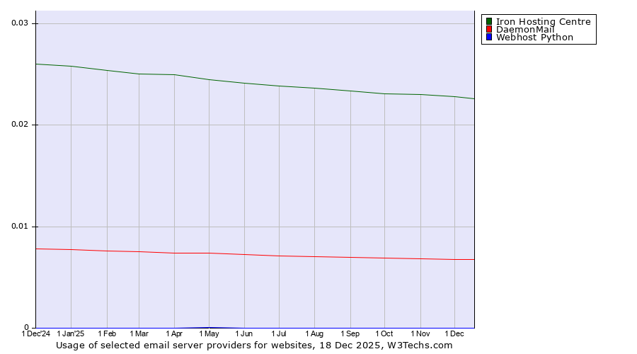 TechnologiesContent ManagementServer-side Languages Client-side Languages JavaScript Libraries CSS Frameworks Web Servers Web Panels Operating Systems Web Hosting Data Centers Reverse Proxies DNS Servers Email Servers SSL Certificate Authorities Content Delivery Traffic Analysis Tools Advertising Networks Tag Managers Social Widgets Site Elements Structured Data Markup Languages Character Encodings Image File Formats Top Level Domains Server Locations Content Languages | Technologies > Email Servers > Technology usage comparison Comparison of the usage statistics of Iron Hosting Centre vs. DaemonMail vs. Webhost Python for websitesThis report shows the usage statistics of Iron Hosting Centre vs. DaemonMail vs. Webhost Python as email server provider on the web. See technologies overview for explanations on the methodologies used in the surveys. Our reports are updated daily. UsageThis diagram shows the percentages of websites using the selected technologies. How to read the diagram: