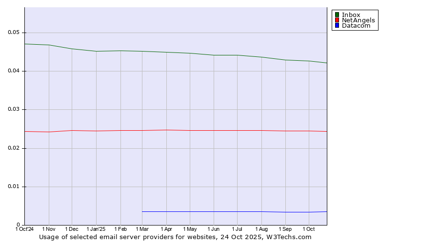 TechnologiesContent ManagementServer-side Languages Client-side Languages JavaScript Libraries CSS Frameworks Web Servers Web Panels Operating Systems Web Hosting Data Centers Reverse Proxies DNS Servers Email Servers SSL Certificate Authorities Content Delivery Traffic Analysis Tools Advertising Networks Tag Managers Social Widgets Site Elements Structured Data Markup Languages Character Encodings Image File Formats Top Level Domains Server Locations Content Languages | Technologies > Email Servers > Technology usage comparison Comparison of the usage statistics of Inbox vs. NetAngels vs. Datacom for websitesThis report shows the usage statistics of Inbox vs. NetAngels vs. Datacom as email server provider on the web. See technologies overview for explanations on the methodologies used in the surveys. Our reports are updated daily. UsageThis diagram shows the percentages of websites using the selected technologies. How to read the diagram: