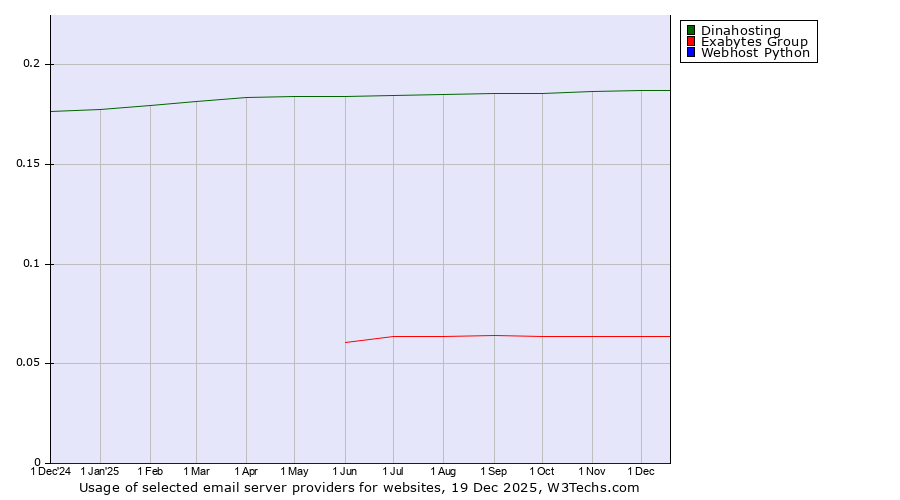 TechnologiesContent ManagementServer-side Languages Client-side Languages JavaScript Libraries CSS Frameworks Web Servers Web Panels Operating Systems Web Hosting Data Centers Reverse Proxies DNS Servers Email Servers SSL Certificate Authorities Content Delivery Traffic Analysis Tools Advertising Networks Tag Managers Social Widgets Site Elements Structured Data Markup Languages Character Encodings Image File Formats Top Level Domains Server Locations Content Languages | Technologies > Email Servers > Technology usage comparison Comparison of the usage statistics of Dinahosting vs. Exabytes Group vs. Webhost Python for websitesThis report shows the usage statistics of Dinahosting vs. Exabytes Group vs. Webhost Python as email server provider on the web. See technologies overview for explanations on the methodologies used in the surveys. Our reports are updated daily. UsageThis diagram shows the percentages of websites using the selected technologies. How to read the diagram: