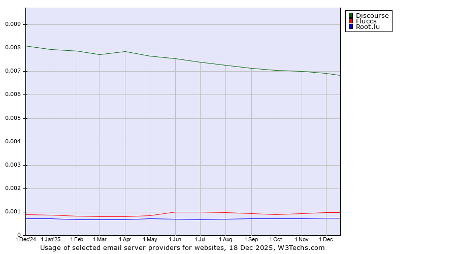 TechnologiesContent ManagementServer-side Languages Client-side Languages JavaScript Libraries CSS Frameworks Web Servers Web Panels Operating Systems Web Hosting Data Centers Reverse Proxies DNS Servers Email Servers SSL Certificate Authorities Content Delivery Traffic Analysis Tools Advertising Networks Tag Managers Social Widgets Site Elements Structured Data Markup Languages Character Encodings Image File Formats Top Level Domains Server Locations Content Languages | Technologies > Email Servers > Technology usage comparison Comparison of the usage statistics of Discourse vs. Fluccs vs. Root.lu for websitesThis report shows the usage statistics of Discourse vs. Fluccs vs. Root.lu as email server provider on the web. See technologies overview for explanations on the methodologies used in the surveys. Our reports are updated daily. UsageThis diagram shows the percentages of websites using the selected technologies. How to read the diagram: