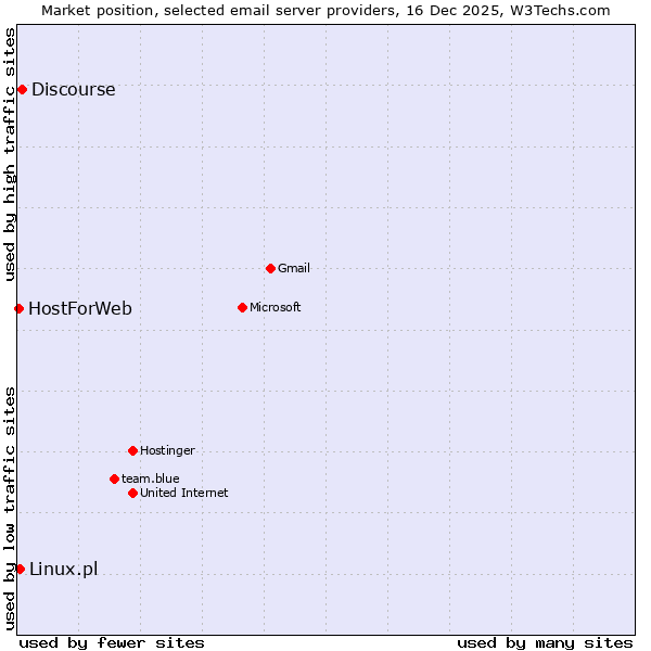 TechnologiesContent ManagementServer-side Languages Client-side Languages JavaScript Libraries CSS Frameworks Web Servers Web Panels Operating Systems Web Hosting Data Centers Reverse Proxies DNS Servers Email Servers SSL Certificate Authorities Content Delivery Traffic Analysis Tools Advertising Networks Tag Managers Social Widgets Site Elements Structured Data Markup Languages Character Encodings Image File Formats Top Level Domains Server Locations Content Languages | Technologies > Email Servers > Technology usage comparison Comparison of the usage statistics of Discourse vs. Linux.pl vs. HostForWeb for websitesThis report shows the usage statistics of Discourse vs. Linux.pl vs. HostForWeb as email server provider on the web. See technologies overview for explanations on the methodologies used in the surveys. Our reports are updated daily. UsageThis diagram shows the percentages of websites using the selected technologies. How to read the diagram: