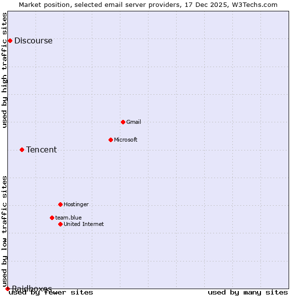 TechnologiesContent ManagementServer-side Languages Client-side Languages JavaScript Libraries CSS Frameworks Web Servers Web Panels Operating Systems Web Hosting Data Centers Reverse Proxies DNS Servers Email Servers SSL Certificate Authorities Content Delivery Traffic Analysis Tools Advertising Networks Tag Managers Social Widgets Site Elements Structured Data Markup Languages Character Encodings Image File Formats Top Level Domains Server Locations Content Languages | Technologies > Email Servers > Technology usage comparison Comparison of the usage statistics of Tencent vs. Discourse vs. Raidboxes for websitesThis report shows the usage statistics of Tencent vs. Discourse vs. Raidboxes as email server provider on the web. See technologies overview for explanations on the methodologies used in the surveys. Our reports are updated daily. UsageThis diagram shows the percentages of websites using the selected technologies. How to read the diagram: