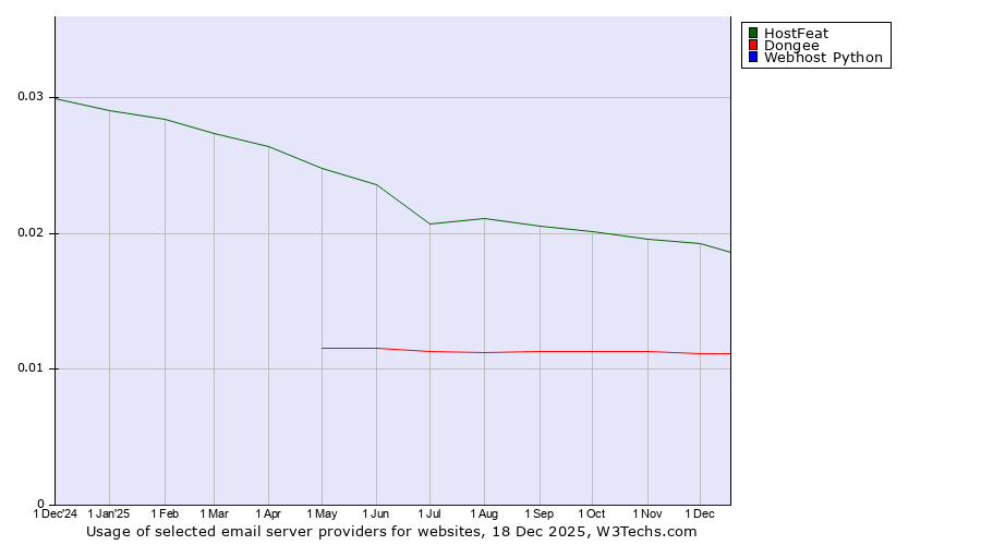 TechnologiesContent ManagementServer-side Languages Client-side Languages JavaScript Libraries CSS Frameworks Web Servers Web Panels Operating Systems Web Hosting Data Centers Reverse Proxies DNS Servers Email Servers SSL Certificate Authorities Content Delivery Traffic Analysis Tools Advertising Networks Tag Managers Social Widgets Site Elements Structured Data Markup Languages Character Encodings Image File Formats Top Level Domains Server Locations Content Languages | Technologies > Email Servers > Technology usage comparison Comparison of the usage statistics of HostFeat vs. Dongee vs. Webhost Python for websitesThis report shows the usage statistics of HostFeat vs. Dongee vs. Webhost Python as email server provider on the web. See technologies overview for explanations on the methodologies used in the surveys. Our reports are updated daily. UsageThis diagram shows the percentages of websites using the selected technologies. How to read the diagram: