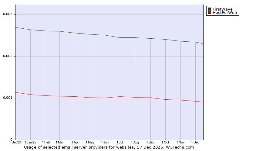 TechnologiesContent ManagementServer-side Languages Client-side Languages JavaScript Libraries CSS Frameworks Web Servers Web Panels Operating Systems Web Hosting Data Centers Reverse Proxies DNS Servers Email Servers SSL Certificate Authorities Content Delivery Traffic Analysis Tools Advertising Networks Tag Managers Social Widgets Site Elements Structured Data Markup Languages Character Encodings Image File Formats Top Level Domains Server Locations Content Languages ComparisonCompare with other | Technologies > Email Servers > Technology usage comparison Comparison of the usage statistics of FirstWave vs. HostForWeb for websitesThis report shows the usage statistics of FirstWave vs. HostForWeb as email server provider on the web. See technologies overview for explanations on the methodologies used in the surveys. Our reports are updated daily. UsageThis diagram shows the percentages of websites using the selected technologies. How to read the diagram: