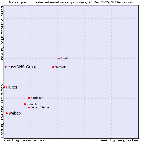 TechnologiesContent ManagementServer-side Languages Client-side Languages JavaScript Libraries CSS Frameworks Web Servers Web Panels Operating Systems Web Hosting Data Centers Reverse Proxies DNS Servers Email Servers SSL Certificate Authorities Content Delivery Traffic Analysis Tools Advertising Networks Tag Managers Social Widgets Site Elements Structured Data Markup Languages Character Encodings Image File Formats Top Level Domains Server Locations Content Languages | Technologies > Email Servers > Technology usage comparison Comparison of the usage statistics of webgo vs. easyDNS Group vs. Fluccs for websitesThis report shows the usage statistics of webgo vs. easyDNS Group vs. Fluccs as email server provider on the web. See technologies overview for explanations on the methodologies used in the surveys. Our reports are updated daily. UsageThis diagram shows the percentages of websites using the selected technologies. How to read the diagram:
