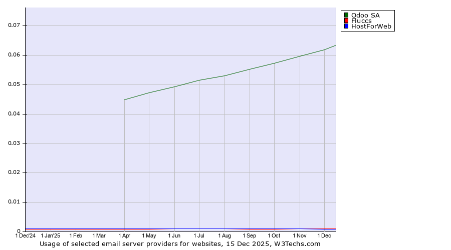 TechnologiesContent ManagementServer-side Languages Client-side Languages JavaScript Libraries CSS Frameworks Web Servers Web Panels Operating Systems Web Hosting Data Centers Reverse Proxies DNS Servers Email Servers SSL Certificate Authorities Content Delivery Traffic Analysis Tools Advertising Networks Tag Managers Social Widgets Site Elements Structured Data Markup Languages Character Encodings Image File Formats Top Level Domains Server Locations Content Languages | Technologies > Email Servers > Technology usage comparison Comparison of the usage statistics of Odoo SA vs. Fluccs vs. HostForWeb for websitesThis report shows the usage statistics of Odoo SA vs. Fluccs vs. HostForWeb as email server provider on the web. See technologies overview for explanations on the methodologies used in the surveys. Our reports are updated daily. UsageThis diagram shows the percentages of websites using the selected technologies. How to read the diagram: