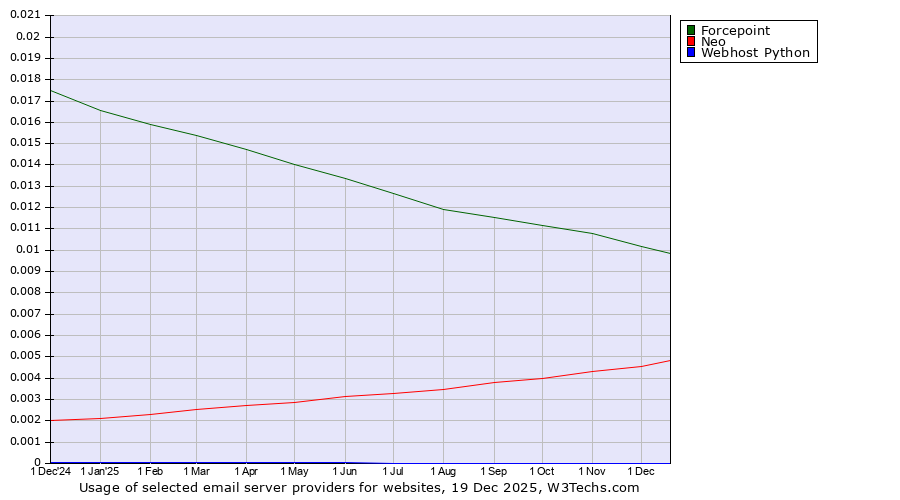 TechnologiesContent ManagementServer-side Languages Client-side Languages JavaScript Libraries CSS Frameworks Web Servers Web Panels Operating Systems Web Hosting Data Centers Reverse Proxies DNS Servers Email Servers SSL Certificate Authorities Content Delivery Traffic Analysis Tools Advertising Networks Tag Managers Social Widgets Site Elements Structured Data Markup Languages Character Encodings Image File Formats Top Level Domains Server Locations Content Languages | Technologies > Email Servers > Technology usage comparison Comparison of the usage statistics of Forcepoint vs. Neo vs. Webhost Python for websitesThis report shows the usage statistics of Forcepoint vs. Neo vs. Webhost Python as email server provider on the web. See technologies overview for explanations on the methodologies used in the surveys. Our reports are updated daily. UsageThis diagram shows the percentages of websites using the selected technologies. How to read the diagram: