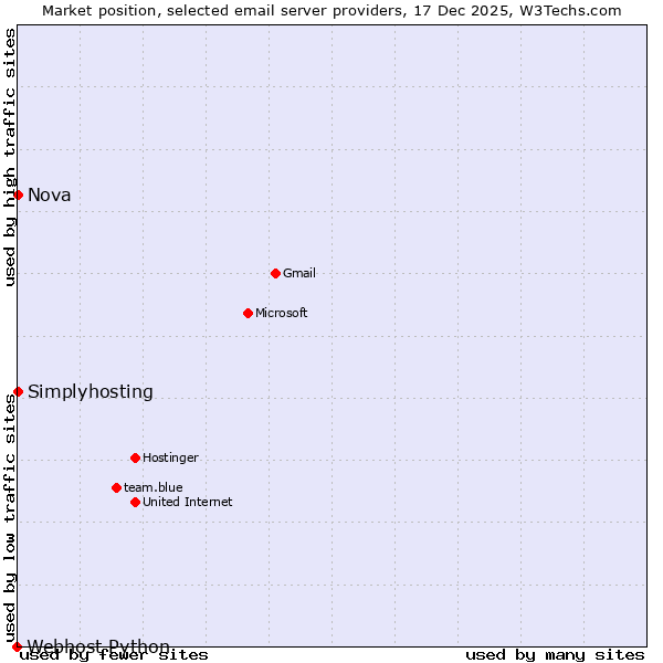 TechnologiesContent ManagementServer-side Languages Client-side Languages JavaScript Libraries CSS Frameworks Web Servers Web Panels Operating Systems Web Hosting Data Centers Reverse Proxies DNS Servers Email Servers SSL Certificate Authorities Content Delivery Traffic Analysis Tools Advertising Networks Tag Managers Social Widgets Site Elements Structured Data Markup Languages Character Encodings Image File Formats Top Level Domains Server Locations Content Languages | Technologies > Email Servers > Technology usage comparison Comparison of the usage statistics of Simplyhosting vs. Nova vs. Webhost Python for websitesThis report shows the usage statistics of Simplyhosting vs. Nova vs. Webhost Python as email server provider on the web. See technologies overview for explanations on the methodologies used in the surveys. Our reports are updated daily. UsageThis diagram shows the percentages of websites using the selected technologies. How to read the diagram: