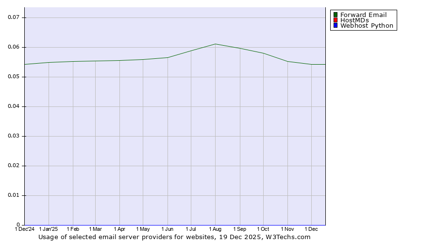 TechnologiesContent ManagementServer-side Languages Client-side Languages JavaScript Libraries CSS Frameworks Web Servers Web Panels Operating Systems Web Hosting Data Centers Reverse Proxies DNS Servers Email Servers SSL Certificate Authorities Content Delivery Traffic Analysis Tools Advertising Networks Tag Managers Social Widgets Site Elements Structured Data Markup Languages Character Encodings Image File Formats Top Level Domains Server Locations Content Languages | Technologies > Email Servers > Technology usage comparison Comparison of the usage statistics of Forward Email vs. HostMDs vs. Webhost Python for websitesThis report shows the usage statistics of Forward Email vs. HostMDs vs. Webhost Python as email server provider on the web. See technologies overview for explanations on the methodologies used in the surveys. Our reports are updated daily. UsageThis diagram shows the percentages of websites using the selected technologies. How to read the diagram: