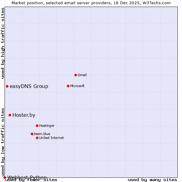 TechnologiesContent ManagementServer-side Languages Client-side Languages JavaScript Libraries CSS Frameworks Web Servers Web Panels Operating Systems Web Hosting Data Centers Reverse Proxies DNS Servers Email Servers SSL Certificate Authorities Content Delivery Traffic Analysis Tools Advertising Networks Tag Managers Social Widgets Site Elements Structured Data Markup Languages Character Encodings Image File Formats Top Level Domains Server Locations Content Languages | Technologies > Email Servers > Technology usage comparison Comparison of the usage statistics of Hoster.by vs. easyDNS Group vs. Webhost Python for websitesThis report shows the usage statistics of Hoster.by vs. easyDNS Group vs. Webhost Python as email server provider on the web. See technologies overview for explanations on the methodologies used in the surveys. Our reports are updated daily. UsageThis diagram shows the percentages of websites using the selected technologies. How to read the diagram:
