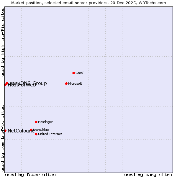 TechnologiesContent ManagementServer-side Languages Client-side Languages JavaScript Libraries CSS Frameworks Web Servers Web Panels Operating Systems Web Hosting Data Centers Reverse Proxies DNS Servers Email Servers SSL Certificate Authorities Content Delivery Traffic Analysis Tools Advertising Networks Tag Managers Social Widgets Site Elements Structured Data Markup Languages Character Encodings Image File Formats Top Level Domains Server Locations Content Languages | Technologies > Email Servers > Technology usage comparison Comparison of the usage statistics of easyDNS Group vs. NetCologne vs. HostForWeb for websitesThis report shows the usage statistics of easyDNS Group vs. NetCologne vs. HostForWeb as email server provider on the web. See technologies overview for explanations on the methodologies used in the surveys. Our reports are updated daily. UsageThis diagram shows the percentages of websites using the selected technologies. How to read the diagram:
