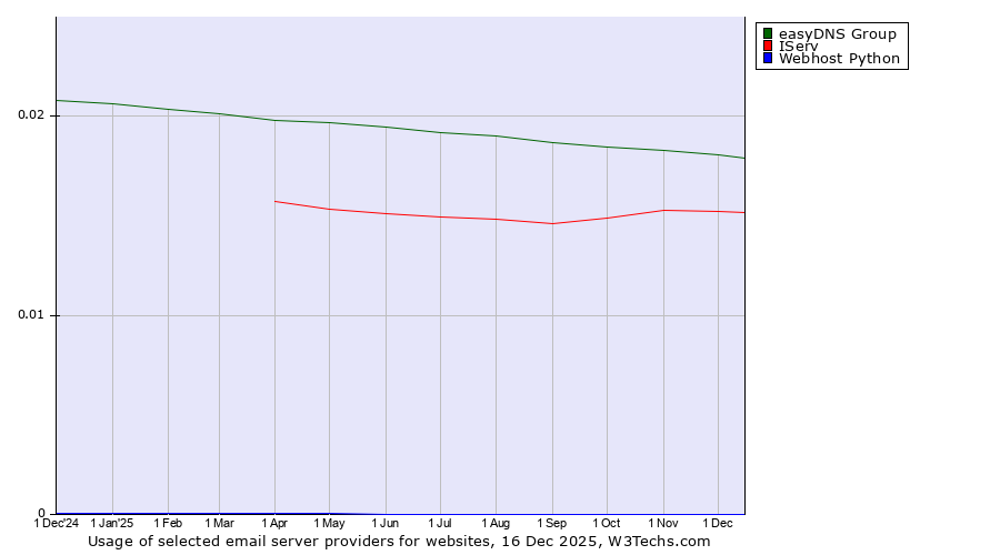 TechnologiesContent ManagementServer-side Languages Client-side Languages JavaScript Libraries CSS Frameworks Web Servers Web Panels Operating Systems Web Hosting Data Centers Reverse Proxies DNS Servers Email Servers SSL Certificate Authorities Content Delivery Traffic Analysis Tools Advertising Networks Tag Managers Social Widgets Site Elements Structured Data Markup Languages Character Encodings Image File Formats Top Level Domains Server Locations Content Languages | Technologies > Email Servers > Technology usage comparison Comparison of the usage statistics of easyDNS Group vs. IServ vs. Webhost Python for websitesThis report shows the usage statistics of easyDNS Group vs. IServ vs. Webhost Python as email server provider on the web. See technologies overview for explanations on the methodologies used in the surveys. Our reports are updated daily. UsageThis diagram shows the percentages of websites using the selected technologies. How to read the diagram: