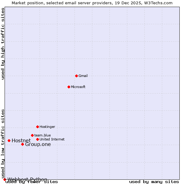 TechnologiesContent ManagementServer-side Languages Client-side Languages JavaScript Libraries CSS Frameworks Web Servers Web Panels Operating Systems Web Hosting Data Centers Reverse Proxies DNS Servers Email Servers SSL Certificate Authorities Content Delivery Traffic Analysis Tools Advertising Networks Tag Managers Social Widgets Site Elements Structured Data Markup Languages Character Encodings Image File Formats Top Level Domains Server Locations Content Languages | Technologies > Email Servers > Technology usage comparison Comparison of the usage statistics of Group.one vs. Hostnet vs. Webhost Python for websitesThis report shows the usage statistics of Group.one vs. Hostnet vs. Webhost Python as email server provider on the web. See technologies overview for explanations on the methodologies used in the surveys. Our reports are updated daily. UsageThis diagram shows the percentages of websites using the selected technologies. How to read the diagram: