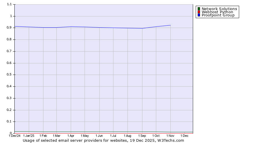 TechnologiesContent ManagementServer-side Languages Client-side Languages JavaScript Libraries CSS Frameworks Web Servers Web Panels Operating Systems Web Hosting Data Centers Reverse Proxies DNS Servers Email Servers SSL Certificate Authorities Content Delivery Traffic Analysis Tools Advertising Networks Tag Managers Social Widgets Site Elements Structured Data Markup Languages Character Encodings Image File Formats Top Level Domains Server Locations Content Languages | Technologies > Email Servers > Technology usage comparison Comparison of the usage statistics of Proofpoint Group vs. Network Solutions vs. Webhost Python for websitesThis report shows the usage statistics of Proofpoint Group vs. Network Solutions vs. Webhost Python as email server provider on the web. See technologies overview for explanations on the methodologies used in the surveys. Our reports are updated daily. UsageThis diagram shows the percentages of websites using the selected technologies. How to read the diagram: