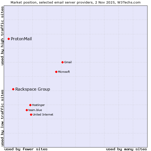 TechnologiesContent ManagementServer-side Languages Client-side Languages JavaScript Libraries CSS Frameworks Web Servers Web Panels Operating Systems Web Hosting Data Centers Reverse Proxies DNS Servers Email Servers SSL Certificate Authorities Content Delivery Traffic Analysis Tools Advertising Networks Tag Managers Social Widgets Site Elements Structured Data Markup Languages Character Encodings Image File Formats Top Level Domains Server Locations Content Languages ComparisonCompare with other | Technologies > Email Servers > Technology usage comparison Comparison of the usage statistics of Rackspace Group vs. ProtonMail for websitesThis report shows the usage statistics of Rackspace Group vs. ProtonMail as email server provider on the web. See technologies overview for explanations on the methodologies used in the surveys. Our reports are updated daily. UsageThis diagram shows the percentages of websites using the selected technologies. How to read the diagram: