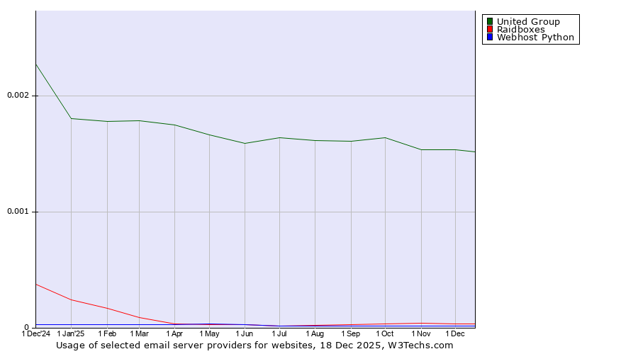 TechnologiesContent ManagementServer-side Languages Client-side Languages JavaScript Libraries CSS Frameworks Web Servers Web Panels Operating Systems Web Hosting Data Centers Reverse Proxies DNS Servers Email Servers SSL Certificate Authorities Content Delivery Traffic Analysis Tools Advertising Networks Tag Managers Social Widgets Site Elements Structured Data Markup Languages Character Encodings Image File Formats Top Level Domains Server Locations Content Languages | Technologies > Email Servers > Technology usage comparison Comparison of the usage statistics of United Group vs. Raidboxes vs. Webhost Python for websitesThis report shows the usage statistics of United Group vs. Raidboxes vs. Webhost Python as email server provider on the web. See technologies overview for explanations on the methodologies used in the surveys. Our reports are updated daily. UsageThis diagram shows the percentages of websites using the selected technologies. How to read the diagram: