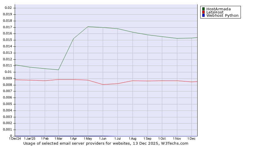 TechnologiesContent ManagementServer-side Languages Client-side Languages JavaScript Libraries CSS Frameworks Web Servers Web Panels Operating Systems Web Hosting Data Centers Reverse Proxies DNS Servers Email Servers SSL Certificate Authorities Content Delivery Traffic Analysis Tools Advertising Networks Tag Managers Social Widgets Site Elements Structured Data Markup Languages Character Encodings Image File Formats Top Level Domains Server Locations Content Languages | Technologies > Email Servers > Technology usage comparison Comparison of the usage statistics of HostArmada vs. LetsHost vs. Webhost Python for websitesThis report shows the usage statistics of HostArmada vs. LetsHost vs. Webhost Python as email server provider on the web. See technologies overview for explanations on the methodologies used in the surveys. Our reports are updated daily. UsageThis diagram shows the percentages of websites using the selected technologies. How to read the diagram: