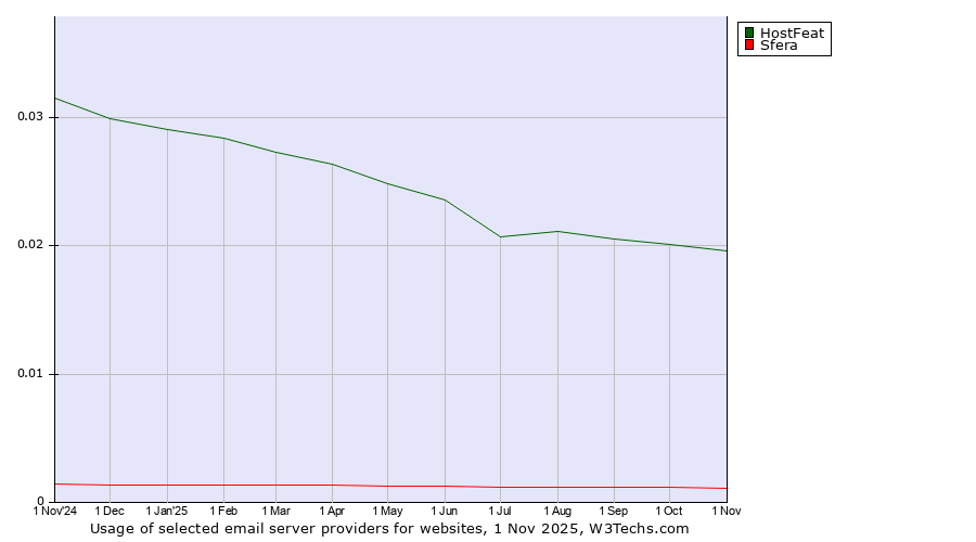 TechnologiesContent ManagementServer-side Languages Client-side Languages JavaScript Libraries CSS Frameworks Web Servers Web Panels Operating Systems Web Hosting Data Centers Reverse Proxies DNS Servers Email Servers SSL Certificate Authorities Content Delivery Traffic Analysis Tools Advertising Networks Tag Managers Social Widgets Site Elements Structured Data Markup Languages Character Encodings Image File Formats Top Level Domains Server Locations Content Languages ComparisonCompare with other | Technologies > Email Servers > Technology usage comparison Comparison of the usage statistics of HostFeat vs. Sfera for websitesThis report shows the usage statistics of HostFeat vs. Sfera as email server provider on the web. See technologies overview for explanations on the methodologies used in the surveys. Our reports are updated daily. UsageThis diagram shows the percentages of websites using the selected technologies. How to read the diagram: