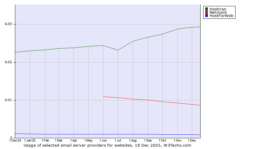 TechnologiesContent ManagementServer-side Languages Client-side Languages JavaScript Libraries CSS Frameworks Web Servers Web Panels Operating Systems Web Hosting Data Centers Reverse Proxies DNS Servers Email Servers SSL Certificate Authorities Content Delivery Traffic Analysis Tools Advertising Networks Tag Managers Social Widgets Site Elements Structured Data Markup Languages Character Encodings Image File Formats Top Level Domains Server Locations Content Languages | Technologies > Email Servers > Technology usage comparison Comparison of the usage statistics of Hostiran vs. Netmark vs. HostForWeb for websitesThis report shows the usage statistics of Hostiran vs. Netmark vs. HostForWeb as email server provider on the web. See technologies overview for explanations on the methodologies used in the surveys. Our reports are updated daily. UsageThis diagram shows the percentages of websites using the selected technologies. How to read the diagram: