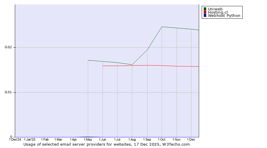 TechnologiesContent ManagementServer-side Languages Client-side Languages JavaScript Libraries CSS Frameworks Web Servers Web Panels Operating Systems Web Hosting Data Centers Reverse Proxies DNS Servers Email Servers SSL Certificate Authorities Content Delivery Traffic Analysis Tools Advertising Networks Tag Managers Social Widgets Site Elements Structured Data Markup Languages Character Encodings Image File Formats Top Level Domains Server Locations Content Languages | Technologies > Email Servers > Technology usage comparison Comparison of the usage statistics of Uniweb vs. Hosting.cl vs. Webhost Python for websitesThis report shows the usage statistics of Uniweb vs. Hosting.cl vs. Webhost Python as email server provider on the web. See technologies overview for explanations on the methodologies used in the surveys. Our reports are updated daily. UsageThis diagram shows the percentages of websites using the selected technologies. How to read the diagram: