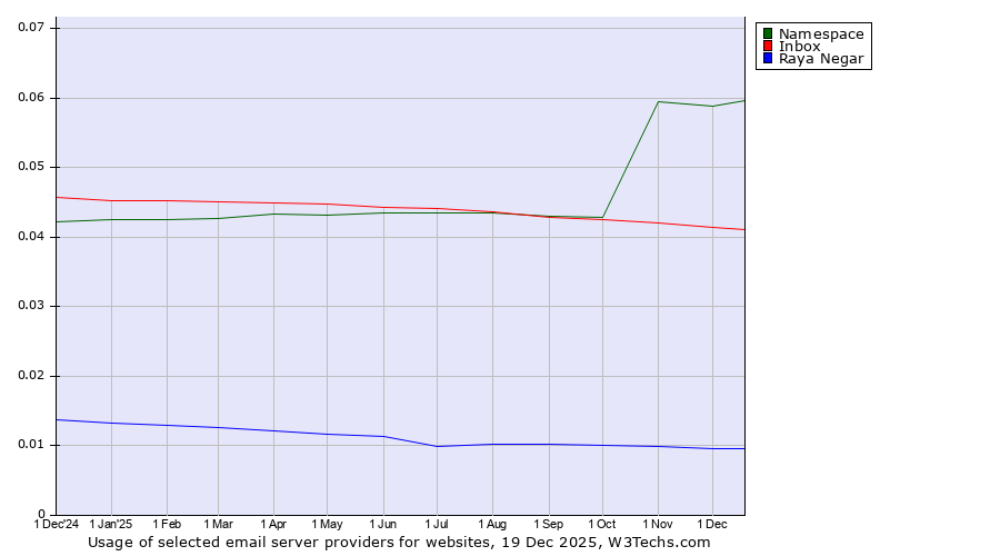TechnologiesContent ManagementServer-side Languages Client-side Languages JavaScript Libraries CSS Frameworks Web Servers Web Panels Operating Systems Web Hosting Data Centers Reverse Proxies DNS Servers Email Servers SSL Certificate Authorities Content Delivery Traffic Analysis Tools Advertising Networks Tag Managers Social Widgets Site Elements Structured Data Markup Languages Character Encodings Image File Formats Top Level Domains Server Locations Content Languages | Technologies > Email Servers > Technology usage comparison Comparison of the usage statistics of Namespace vs. Inbox vs. Raya Negar for websitesThis report shows the usage statistics of Namespace vs. Inbox vs. Raya Negar as email server provider on the web. See technologies overview for explanations on the methodologies used in the surveys. Our reports are updated daily. UsageThis diagram shows the percentages of websites using the selected technologies. How to read the diagram: